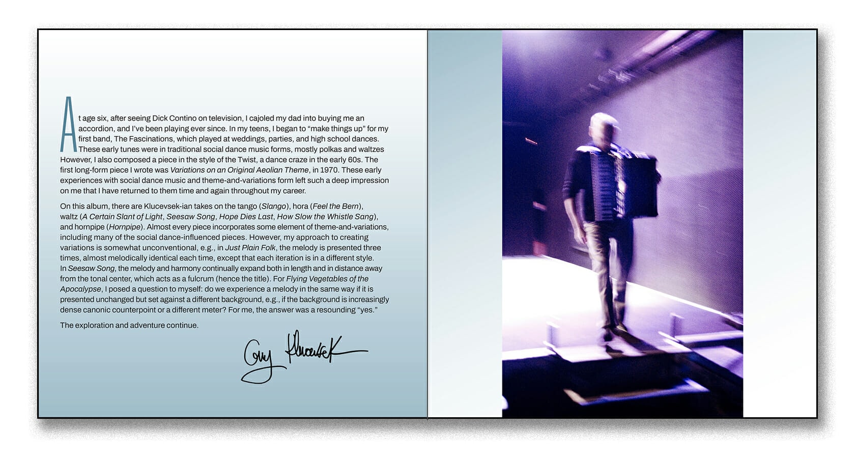 Anyone can download the release’s 17-page PDF booklet, containing: a personal introduction from Klucevsek, his notes for all pieces, his bio, a complete track listing, photos, more. Buyers of this digital-only album at Bandcamp will automatically receive the PDF booklet.