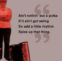The new Starkland double-CD release offers 29 polka pieces, ranging from Sharp’s punk-infused Happy Chappie Polka, Frith’s humorous The Disinformation Polka, and King’s slyly political song about a one-legged polka, to Finch’s beautiful Prairie Dogs, Obrecht’s witty Guy, Won’t You Play Your Accordion, and Connette’s poignant Wild Goose.